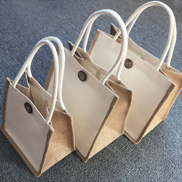 Questa borsa di tela è realizzata in tela e materiali di iuta, con tessuto di iuta sui lati e sul fondo, che consente alla borsa di stare meglio. La chiusura con bottone mantiene gli oggetti al sicuro. Ha molto spazio per vestiti, cibo, crema solare, occhiali da sole, cosmetici e altro ancora. Abbinarlo a una sciarpa unica crea un look sorprendente ai matrimoni o ad altre feste. Con la stampa personalizzata, il nostro team ti assisterà nella realizzazione di borse in tela che catturino l'attenzione!